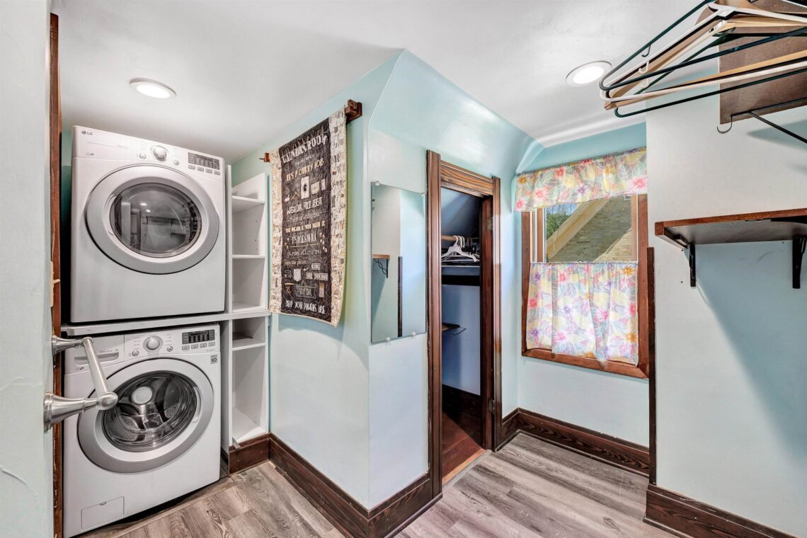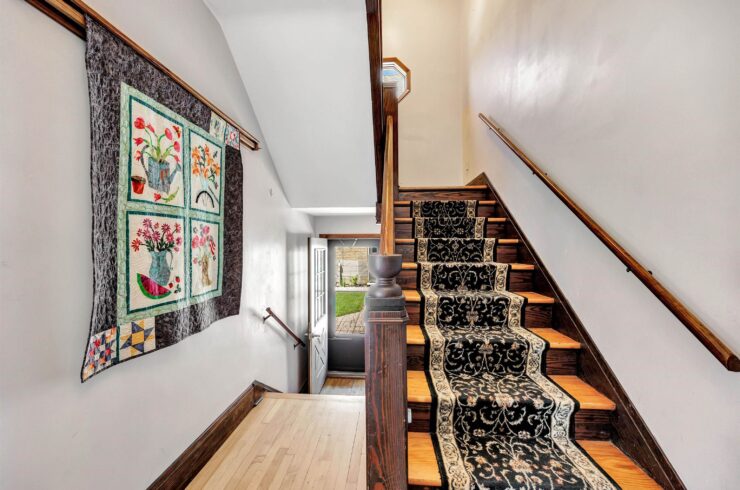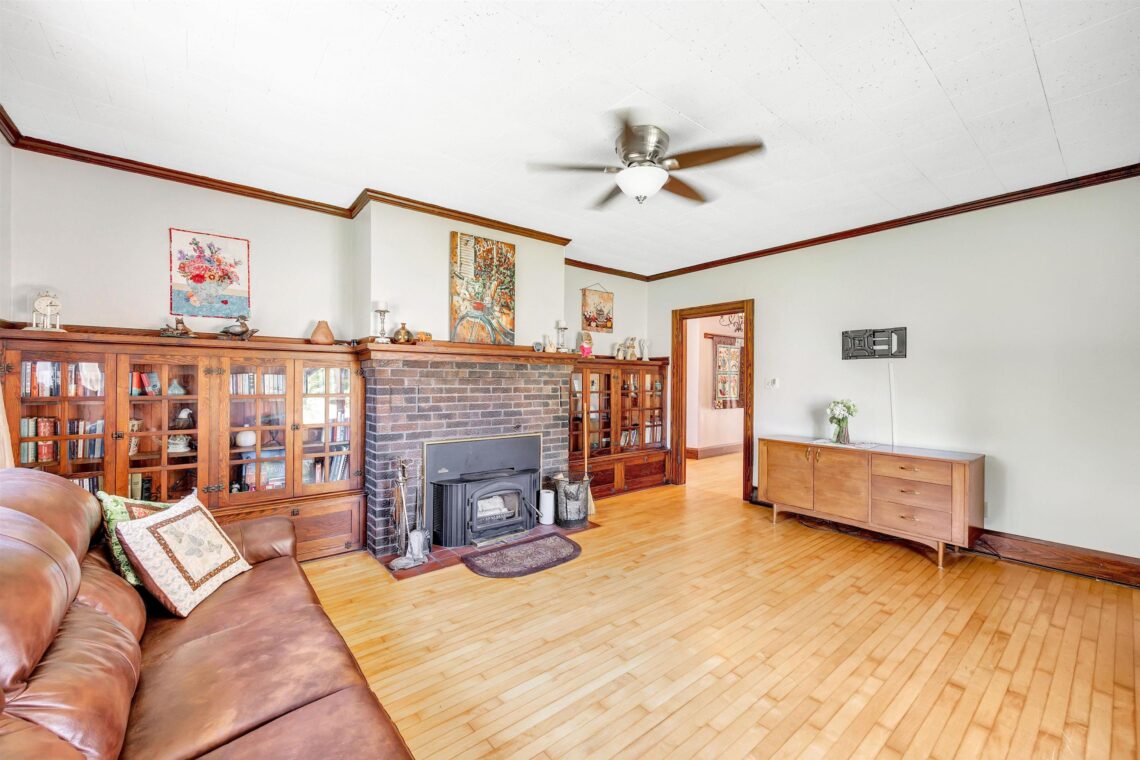 Built in 1923, the residence is the perfect, warm counterpoint to the dramatic scale of the sanctuary. After a day of planning or working on a monumental project, the new owners can retreat to a space that feels instantly comfortable. The interior is characterized by classic Craftsman charm: beautiful open staircases, rich original woodwork, and the quintessential built-in bookcases surrounding a cozy wood-burning fireplace.